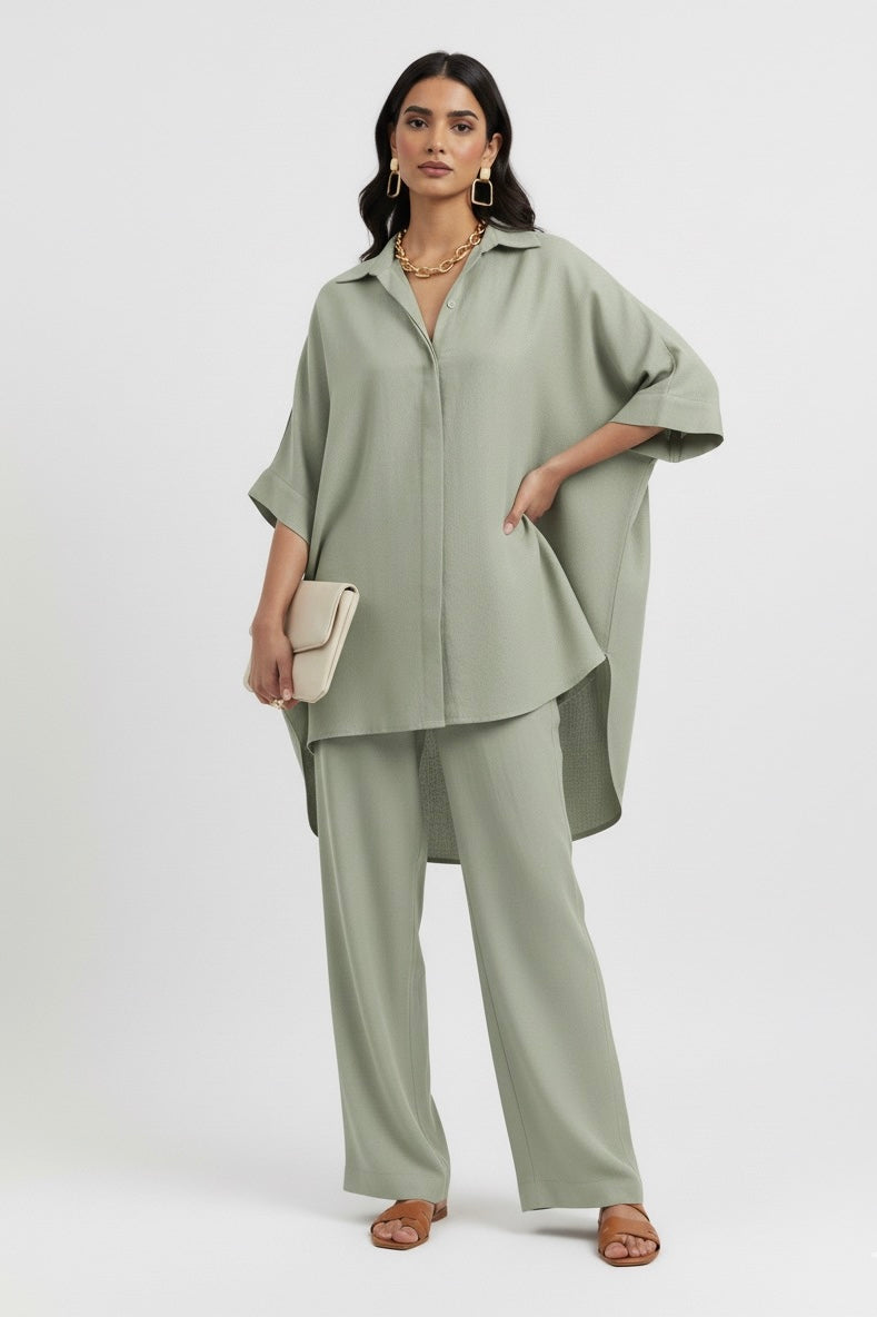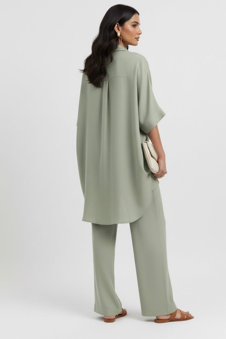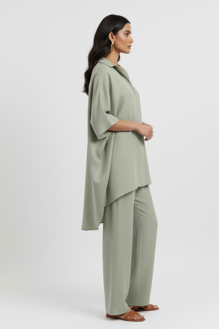Effortless style meets all-day comfort in this chic white co-ord set. Crafted from premium blend fabric, the ensemble features a relaxed-fit top with a sleek V-neckline and wide sleeves for a breezy, modern look. Paired with flowy wide-leg trousers, it offers both versatility and elegance – perfect for casual outings, workdays, or travel.