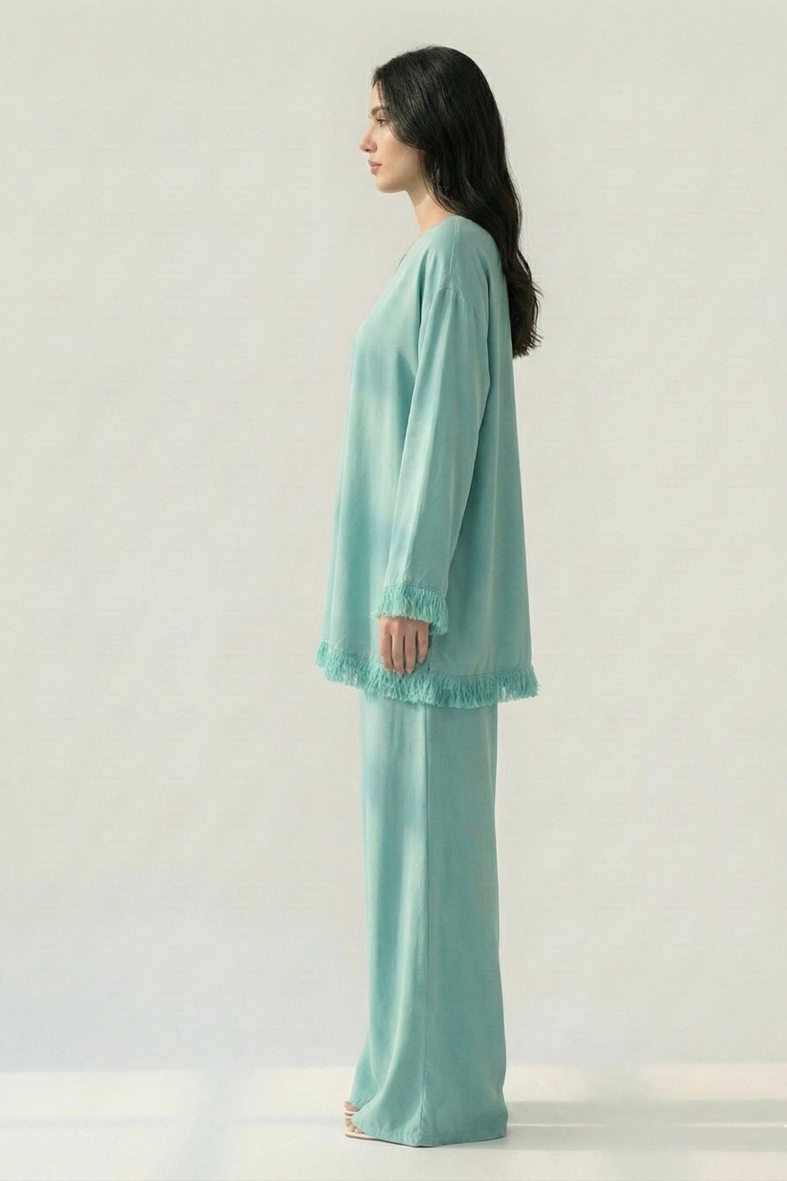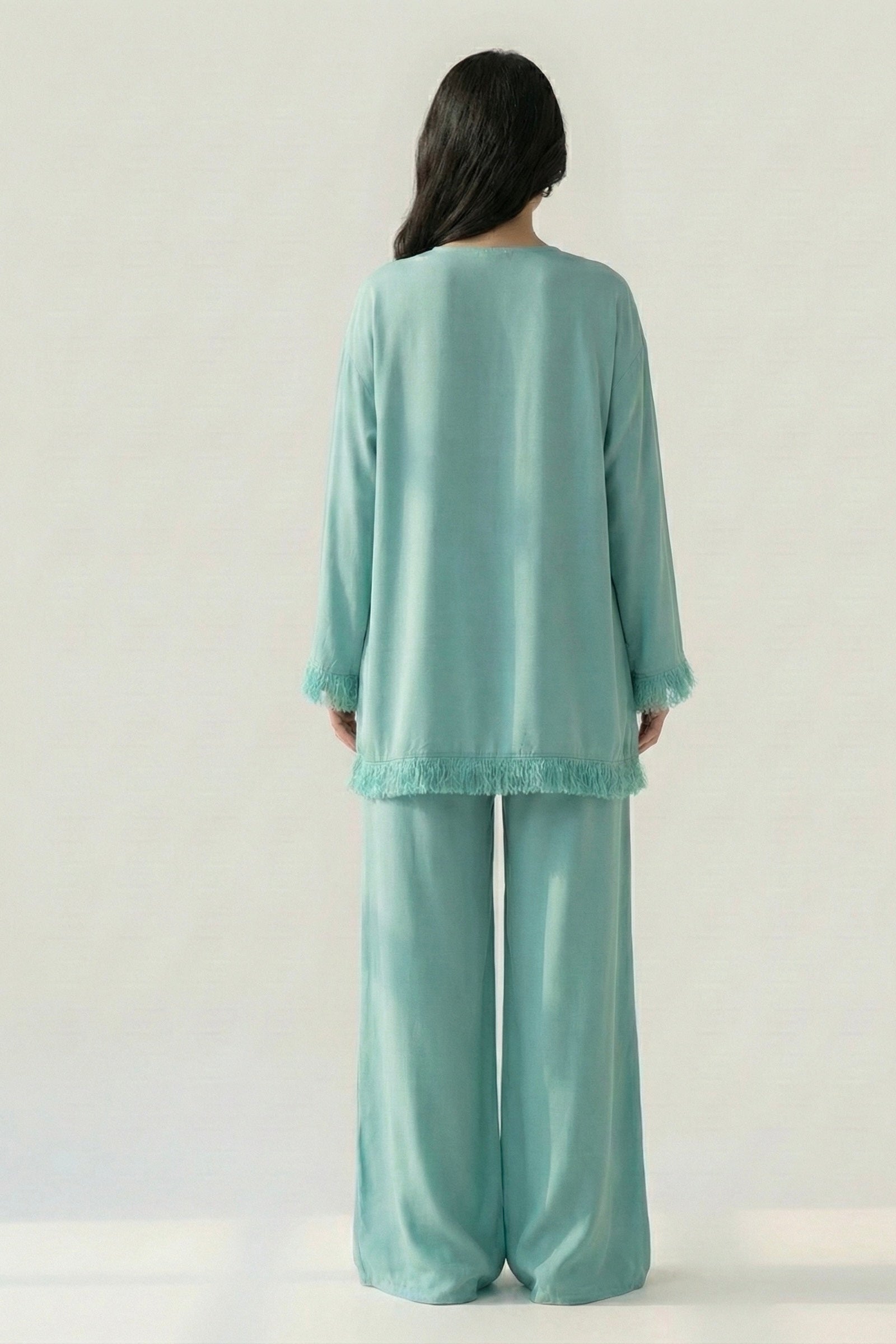 The shirt features a straight, loose cut with delicate fringe detailing along the hem and sleeves, adding a subtle statement finish. Paired with wide-leg trousers, the look feels modern, fluid, and timeless — perfect for day to evening wear.