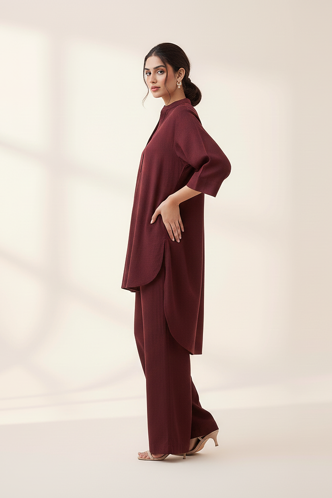 Effortlessly chic and timeless, this blush pink co-ord set is designed for women who love understated elegance. Crafted from a premium textured fabric with a graceful fall, the ensemble features a relaxed long top with a straight silhouette, side slits, and a band collar neckline. The matching wide-leg trousers offer flowy comfort and a refined look that transitions seamlessly from daywear to evening gatherings.