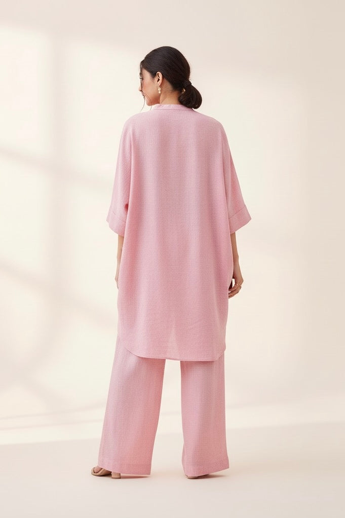 Effortlessly chic and timeless, this blush pink co-ord set is designed for women who love understated elegance. Crafted from a premium textured fabric with a graceful fall, the ensemble features a relaxed long top with a straight silhouette, side slits, and a band collar neckline. The matching wide-leg trousers offer flowy comfort and a refined look that transitions seamlessly from daywear to evening gatherings.