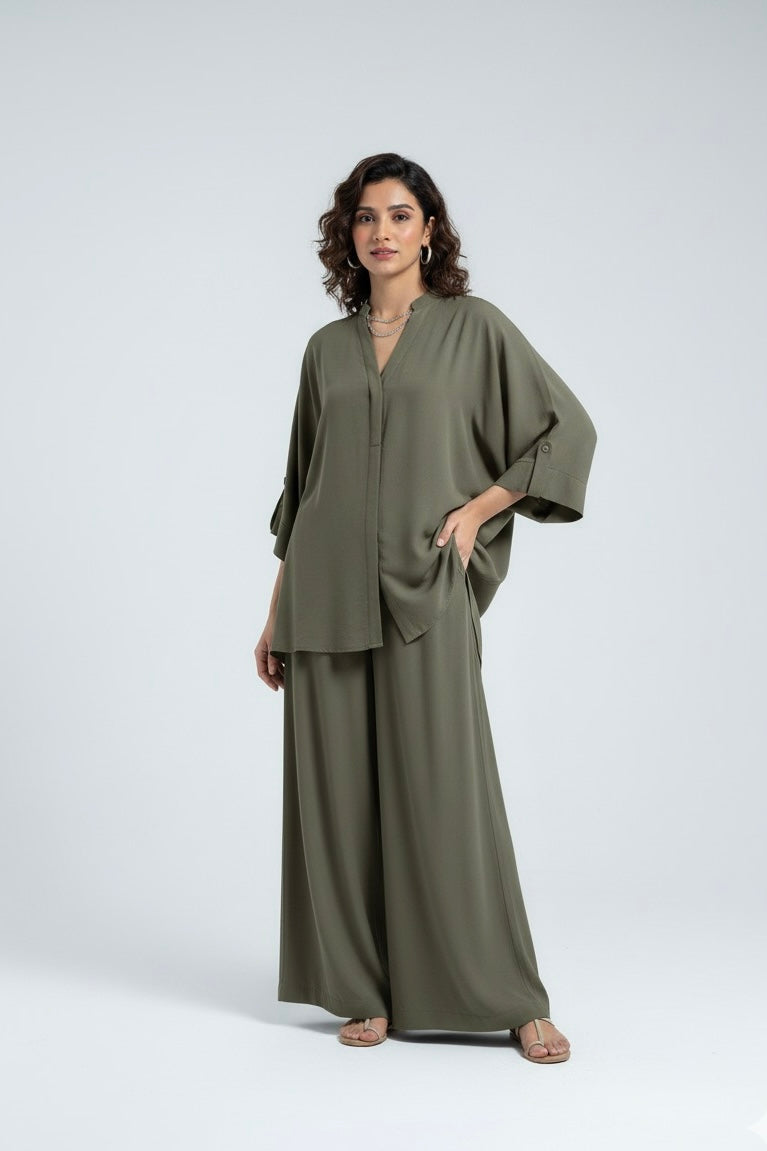 Effortless style meets all-day comfort in this chic olive green co-ord set. Crafted from premium blend fabric, the ensemble features a relaxed-fit top with a sleek V-neckline and wide sleeves for a breezy, modern look. Paired with flowy wide-leg trousers, it offers both versatility and elegance – perfect for casual outings, workdays, or travel.