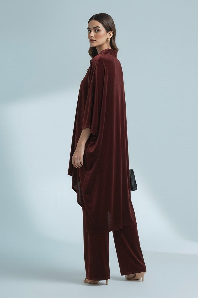 Elevate your winter style with this effortlessly chic velvet co-ord set, designed for comfort, elegance, and a luxe drape. Crafted in premium soft velvet, the outfit features a relaxed, flowy silhouette that flatters every body type and carries a rich maroon sheen perfect for evening wear, dinners, and festive gatherings.