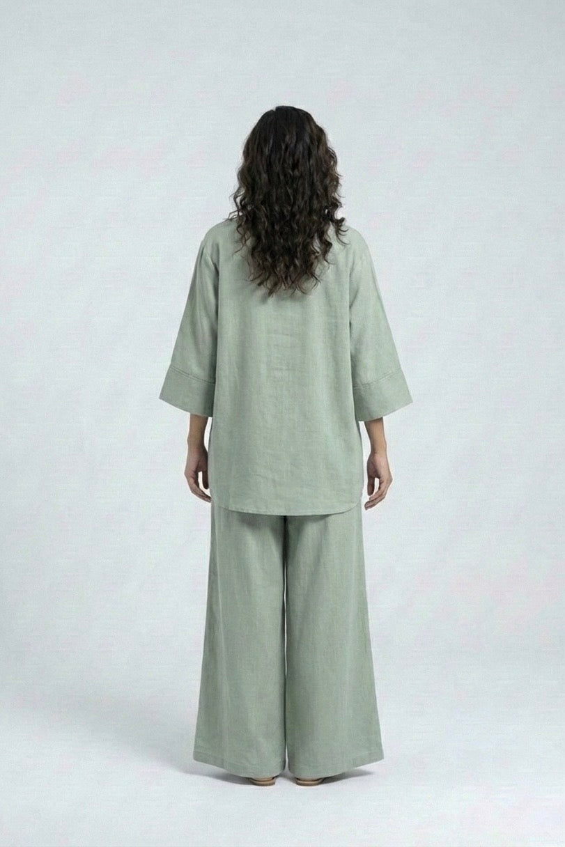 Elevate everyday elegance with this effortlessly refined two-piece coord set, crafted from a premium fabric lawn that drapes beautifully and feels light on the skin. The relaxed shirt features a clean V-slit neckline and fluid sleeves, offering a modern silhouette with understated sophistication.