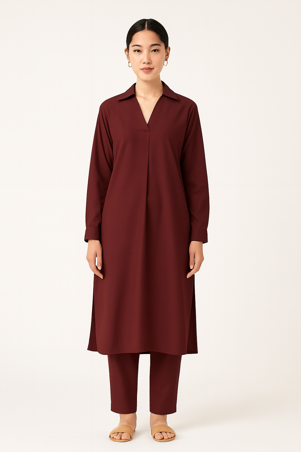 The long kurta features a chic V-neckline with a smart collar, full sleeves with buttoned cuffs, and a sleek straight cut for a graceful drape. Paired with matching straight-leg trousers, this ensemble is versatile enough for both casual and semi-formal wear.