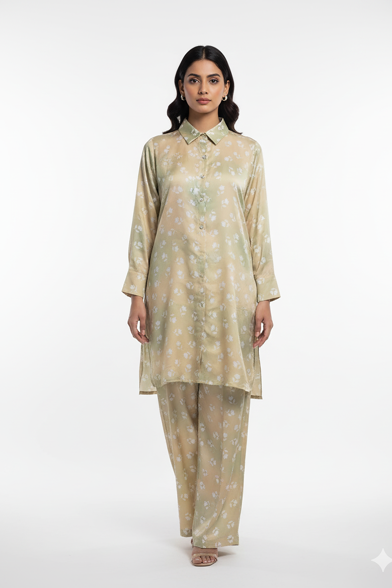 Elevate your wardrobe with this elegant two-piece set crafted from premium charmeuse silk. Designed with a soft sheen and fluid drape, the outfit features a button-down long shirt with a smart collar, full sleeves, and side slits for comfort. Paired with relaxed straight pants, this ensemble offers effortless sophistication with a touch of contemporary style.