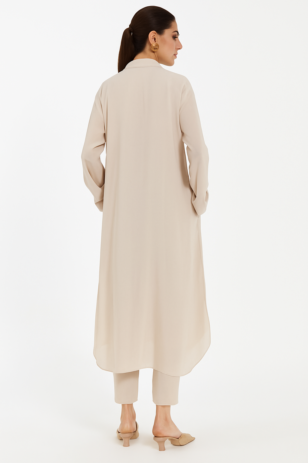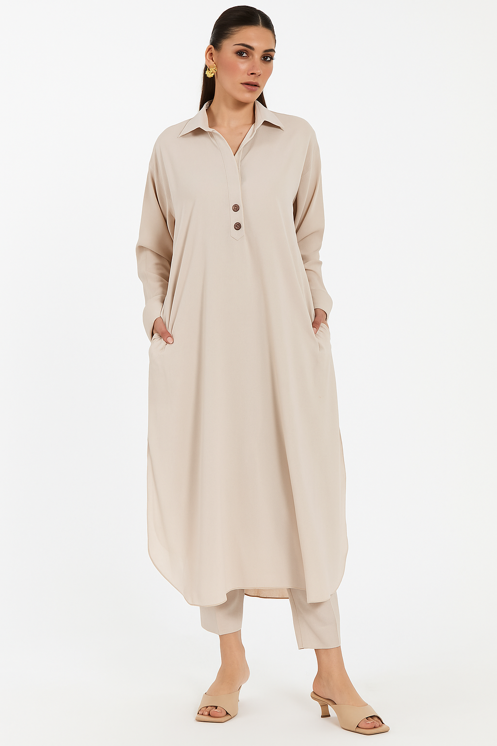 Plain fabric Front Panel, Plain fabric Back Panel, collared button down shirt, Full Sleeves, georgette staright pants.