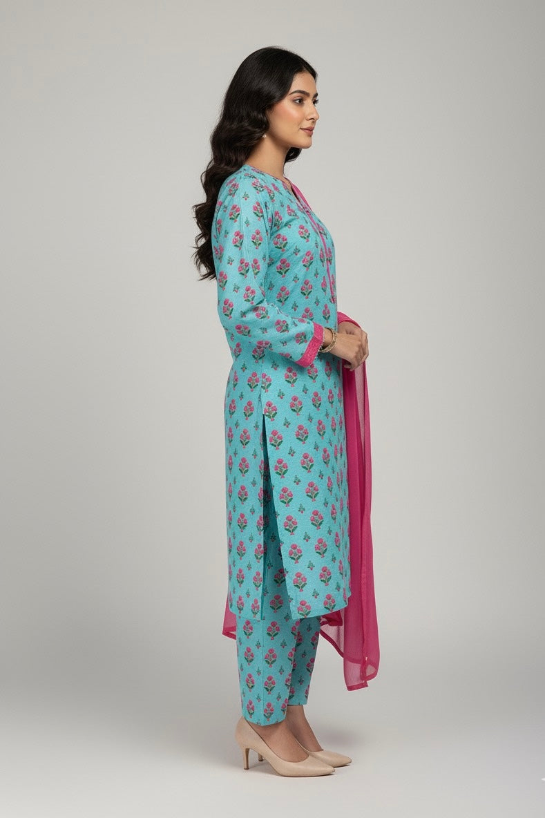 Step into winter elegance with this refreshing aqua blue ensemble adorned with delicate pink floral motifs. The soft slub khaddar fabric ensures warmth and comfort, while the contrast pink detailing on the neckline and sleeves adds a graceful pop of color. Paired with matching printed trousers and a vibrant chiffon dupatta, this outfit perfectly blends tradition and modern charm — ideal for casual day events or cozy evening gatherings.