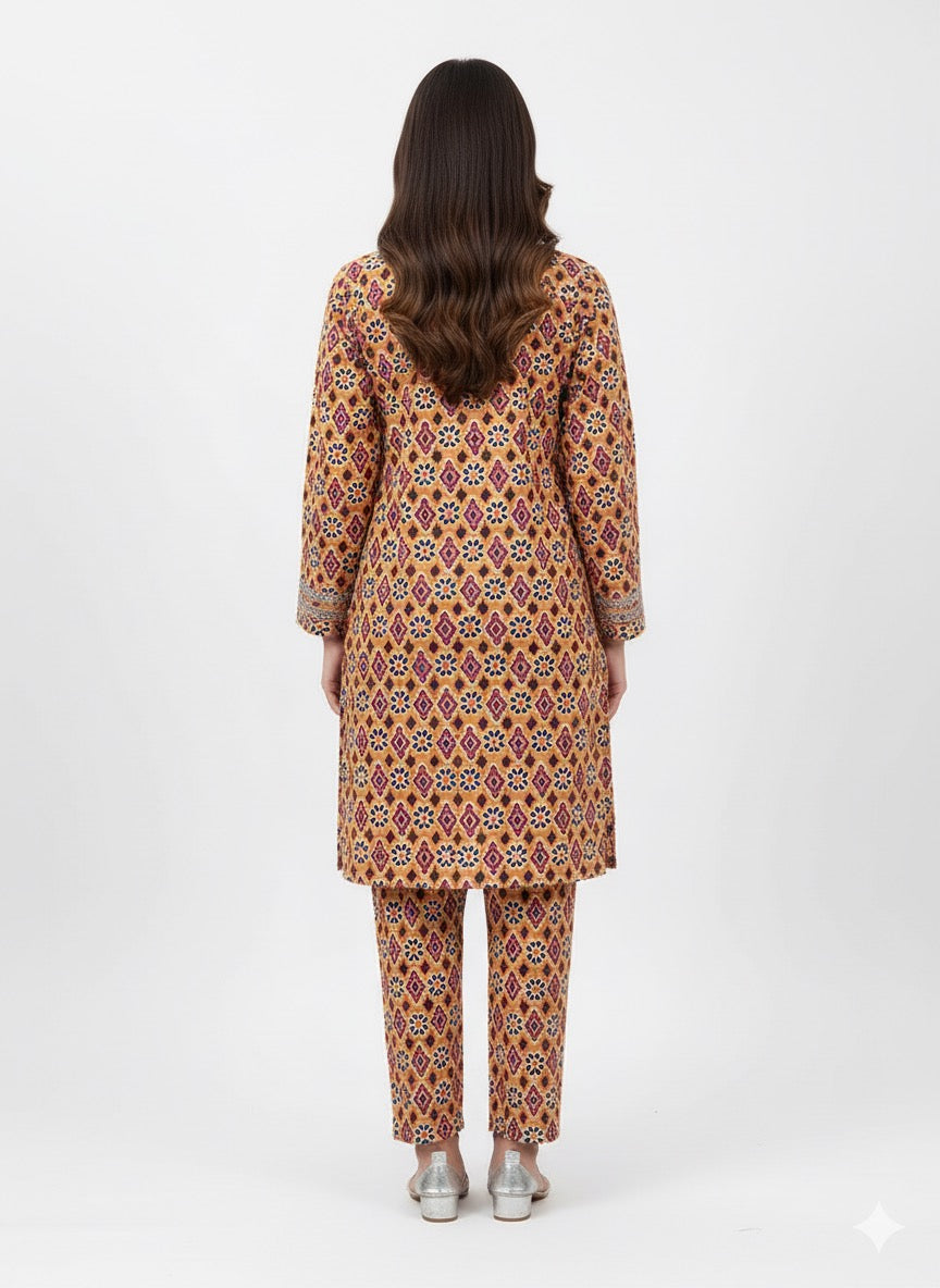 Step into effortless elegance with this beautifully printed two-piece slub khaddar suit. Crafted from premium winter-weight slub khaddar, it offers a soft yet structured drape — perfect for the season. The kurta features an all-over traditional geometric pattern in warm tones, with full sleeves and a straight silhouette for a classic everyday look. Paired with matching printed trousers, this outfit is both stylish and comfortable for daytime wear or casual gatherings.