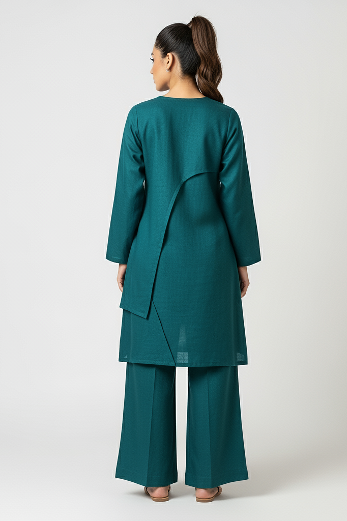 Wide-Leg Trousers: The matching wide-leg trousers are both comfortable and chic, providing a relaxed fit that complements the tunic's graceful flow and adds a powerful silhouette.