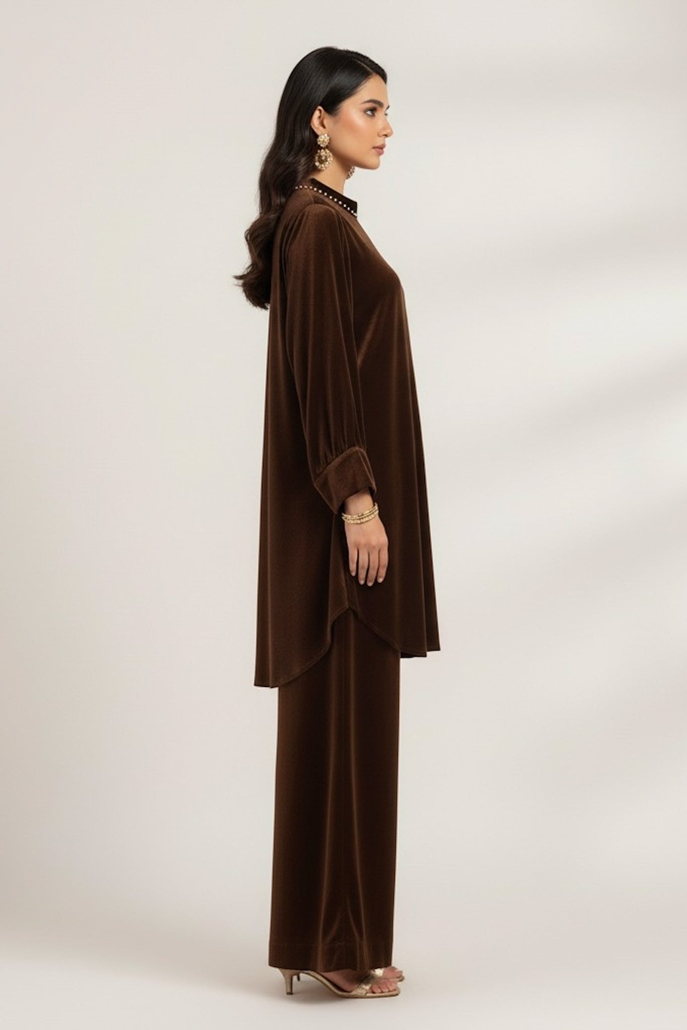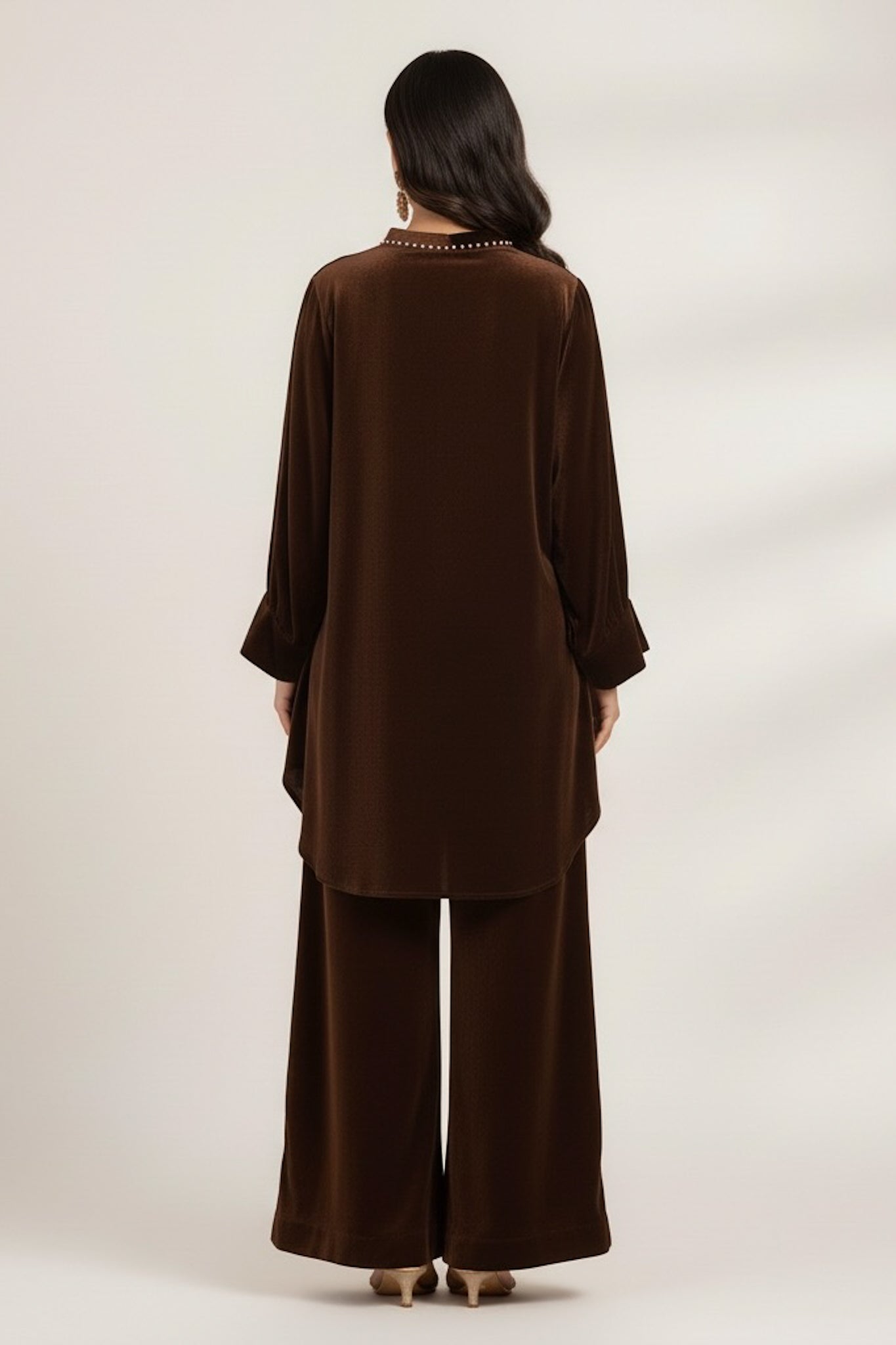 Indulge in effortless elegance with this rich chocolate-brown velvet coord set. The outfit features a flowy, straight-cut shirt with full-length sleeves and a relaxed silhouette, paired with wide-leg trousers that exude understated sophistication. The neckline is adorned with subtle embellishments for a refined festive touch, making it a versatile choice for winter soirées and evening gatherings.
