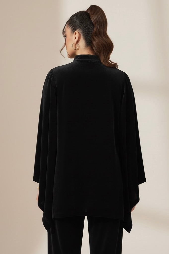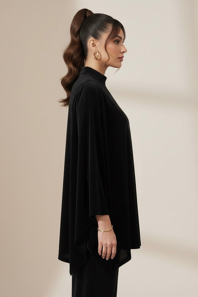 Crafted from luxuriously soft premium velvet, this ensemble features a relaxed poncho-style top with a high neck and draped asymmetrical hem. The rich black tone adds depth and drama, perfect for evening gatherings or festive occasions.
