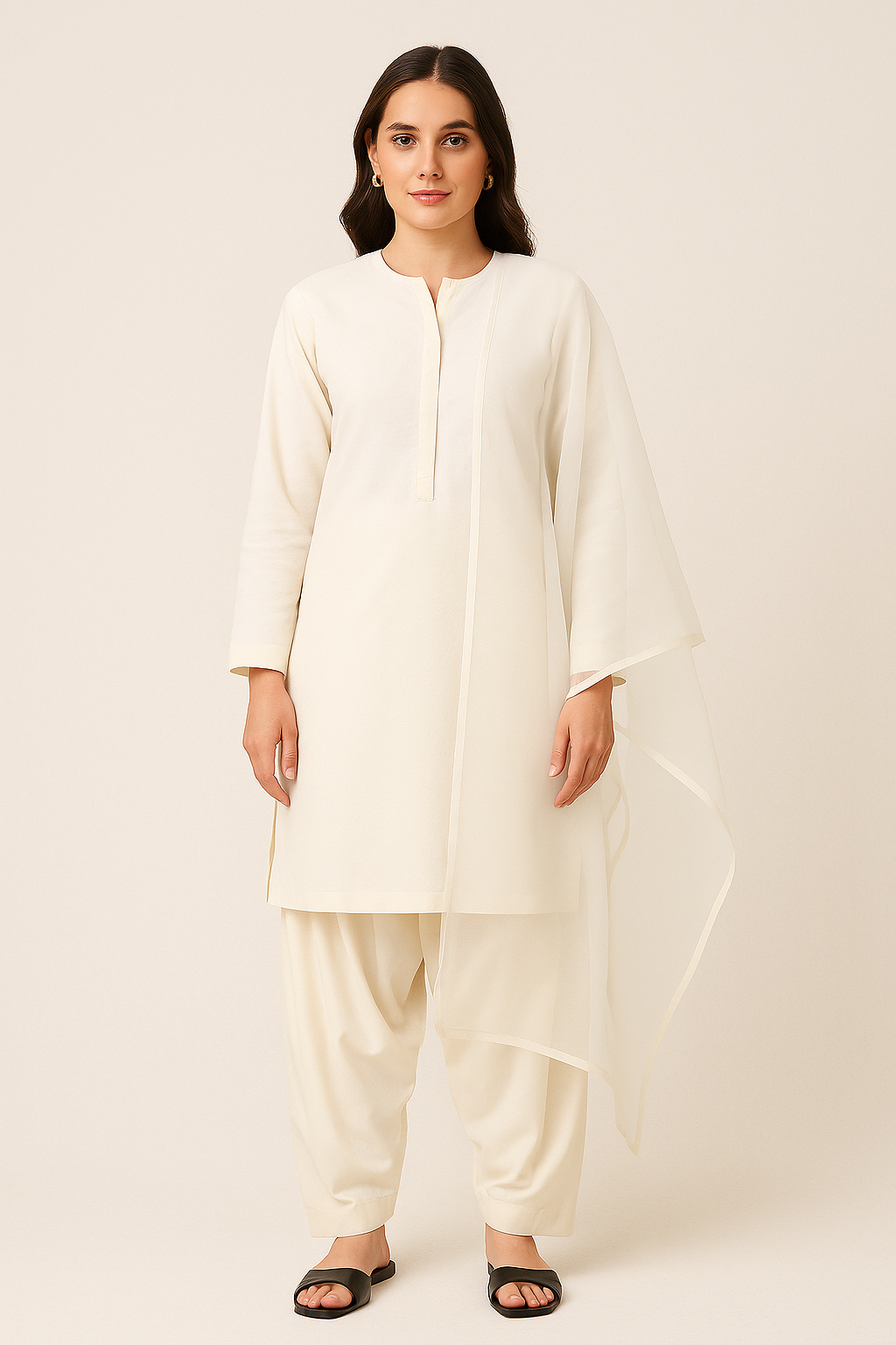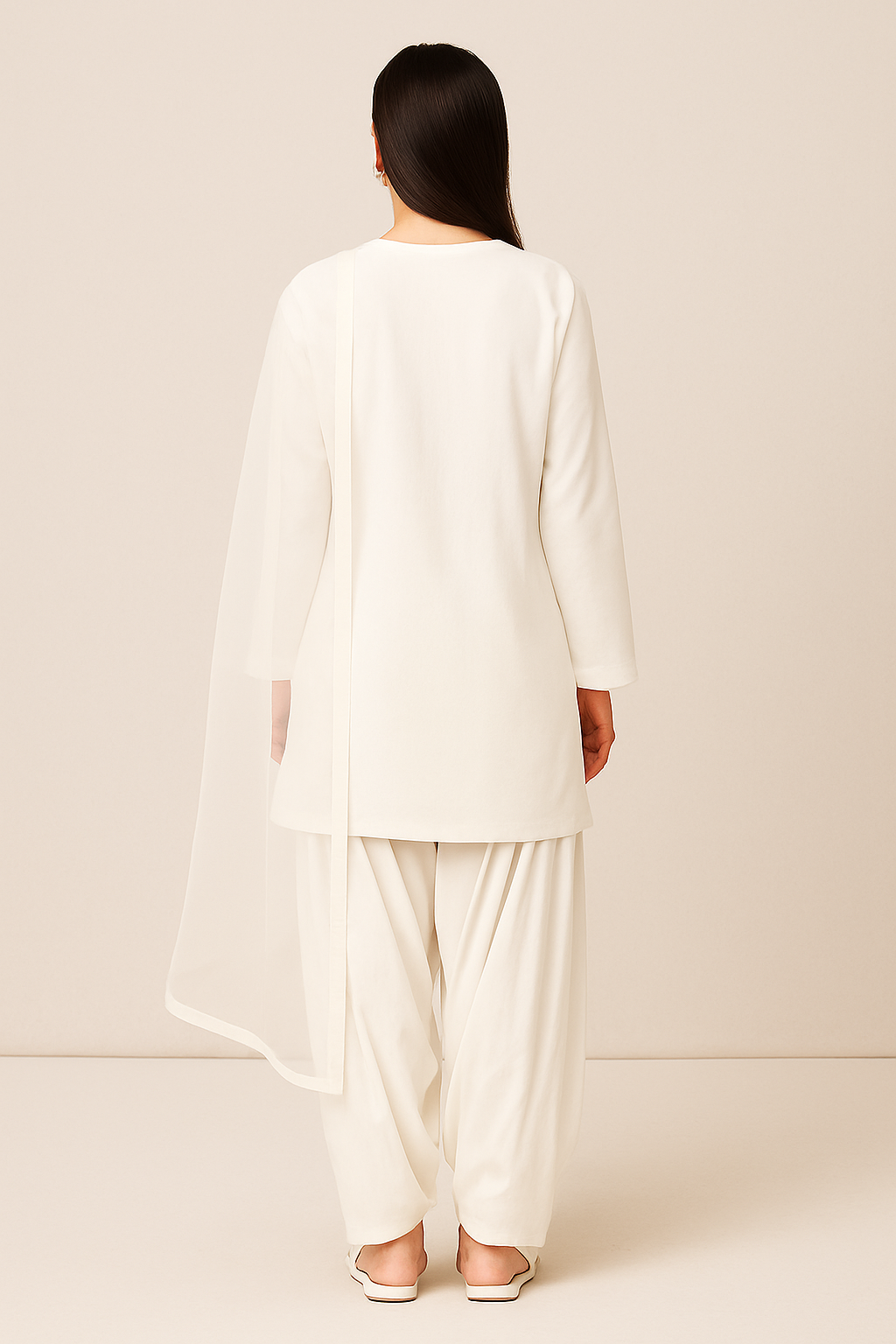 Plain fabric Front Panel, Plain fabric Back Panel, v neck style neckline, Full Sleeves, trousers are patiala style