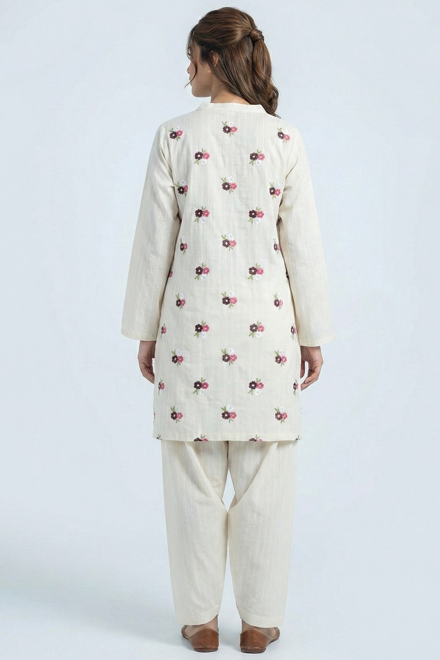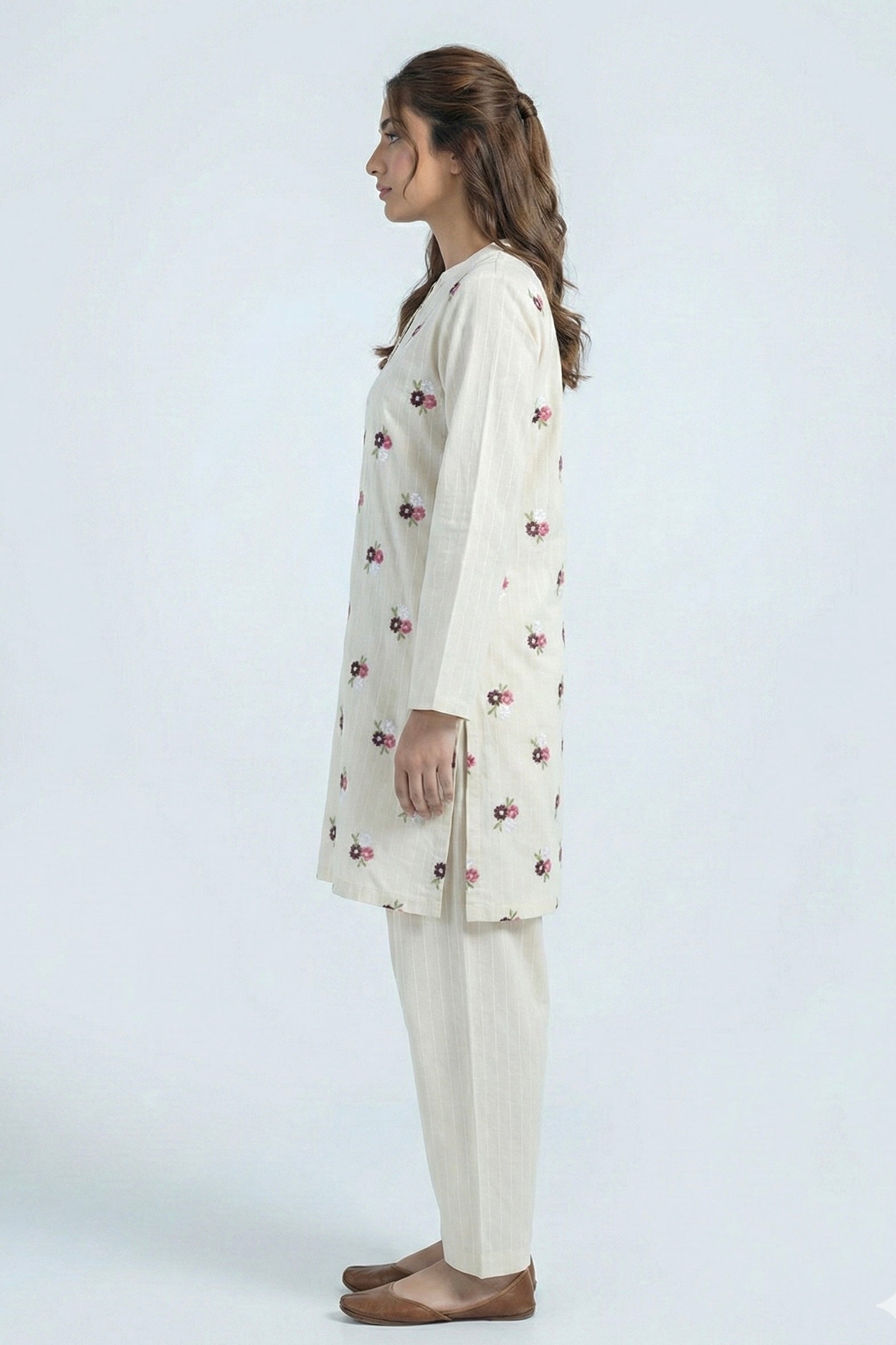 Crafted from breathable winter cotton, this kurta set offers everyday comfort with a soft, cozy feel ideal for cooler days. The fabric has a smooth texture with a gentle structure that keeps its shape while remaining easy to wear throughout the day. Delicate all-over floral prints add a subtle charm, making it perfect for both casual outings and relaxed workwear.