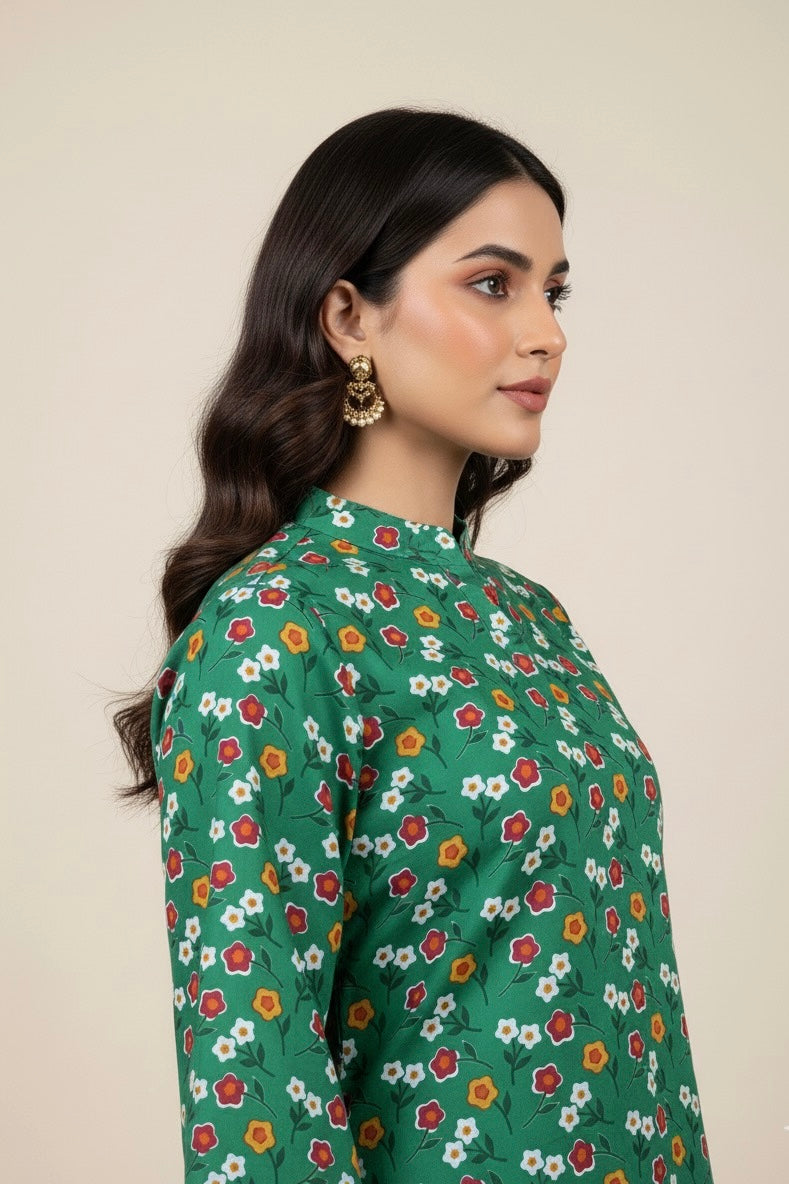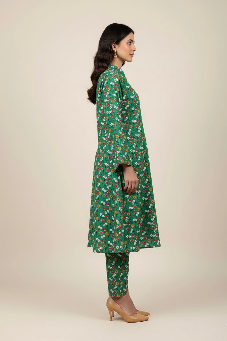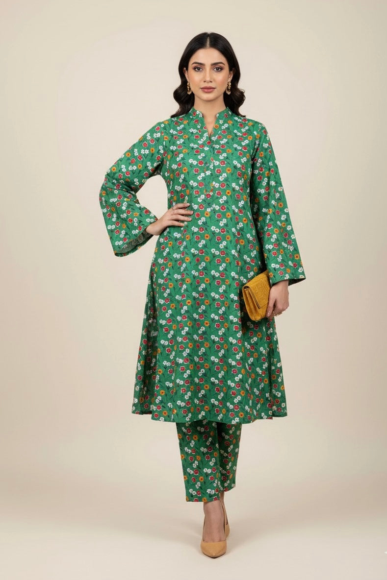 A charming green floral two-piece set crafted in soft winter cotton — cozy, breathable, and effortlessly elegant. The kurta features a flattering A-line cut with a band collar neckline and flared sleeves, paired with straight trousers for a refined finish. Perfect for casual winter days or semi-formal outings.