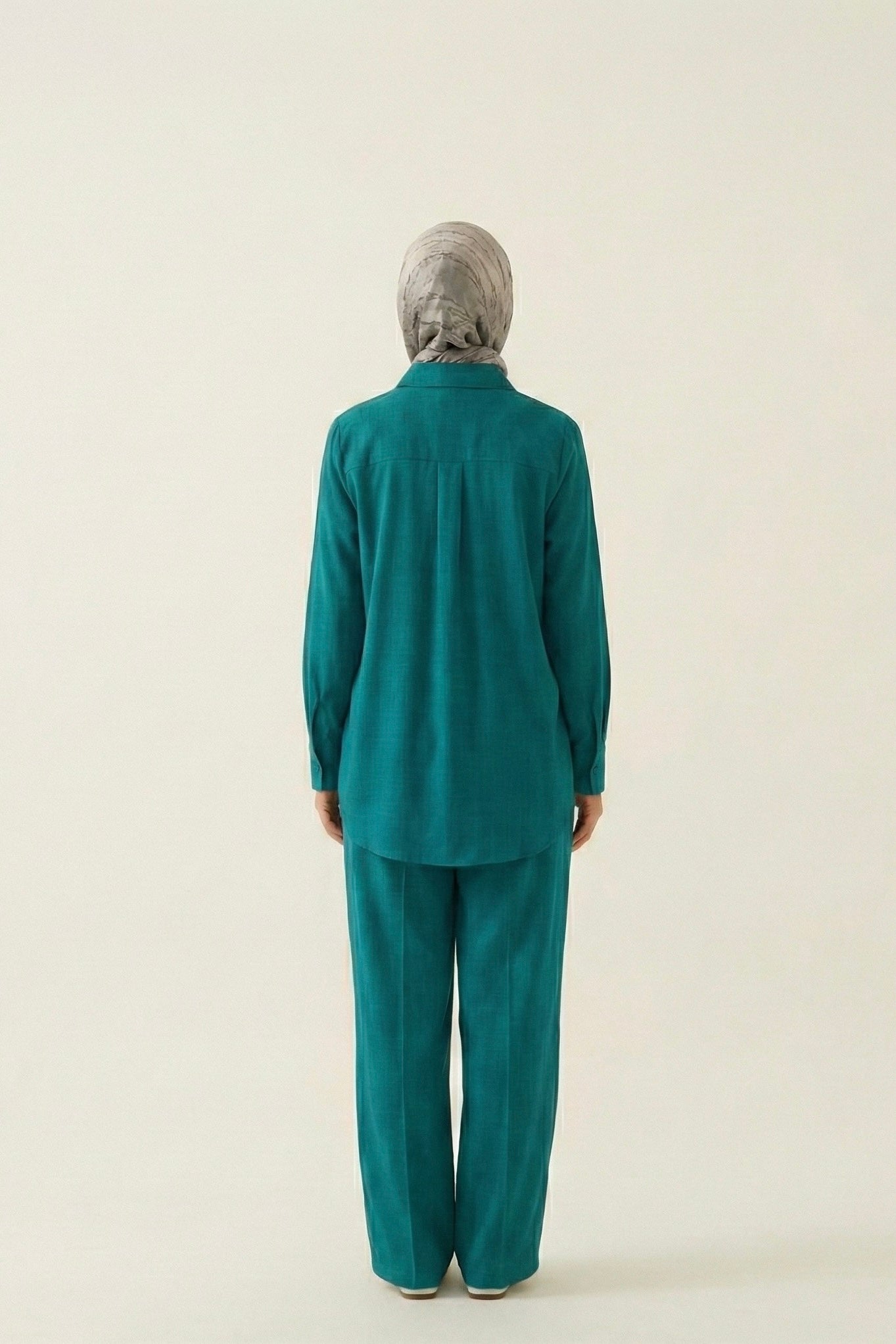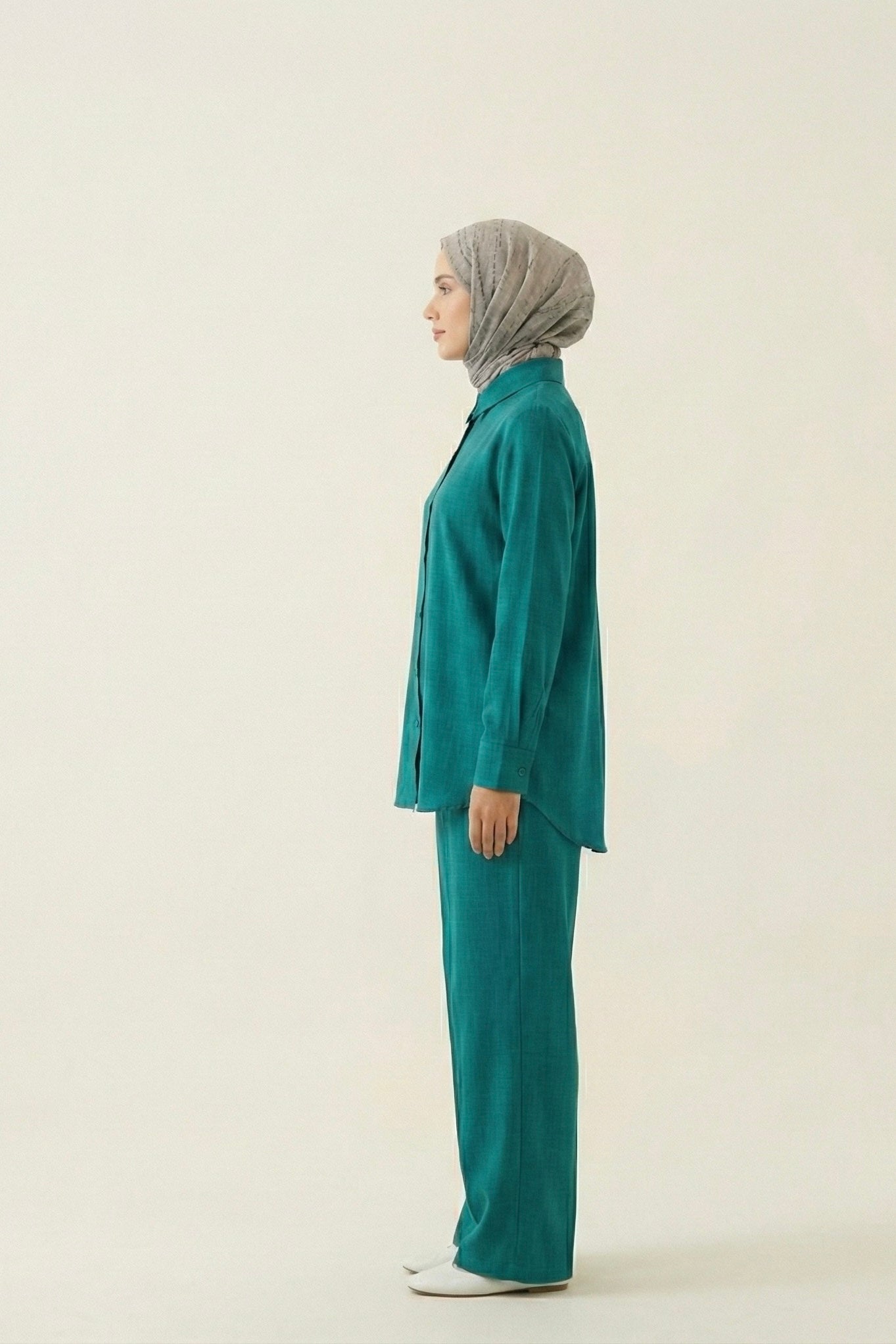 This understated two-piece co-ord set is designed for effortless everyday wear with a refined silhouette. The set features a straight-cut button-down shirt paired with relaxed wide-leg trousers, offering comfort without compromising on structure.