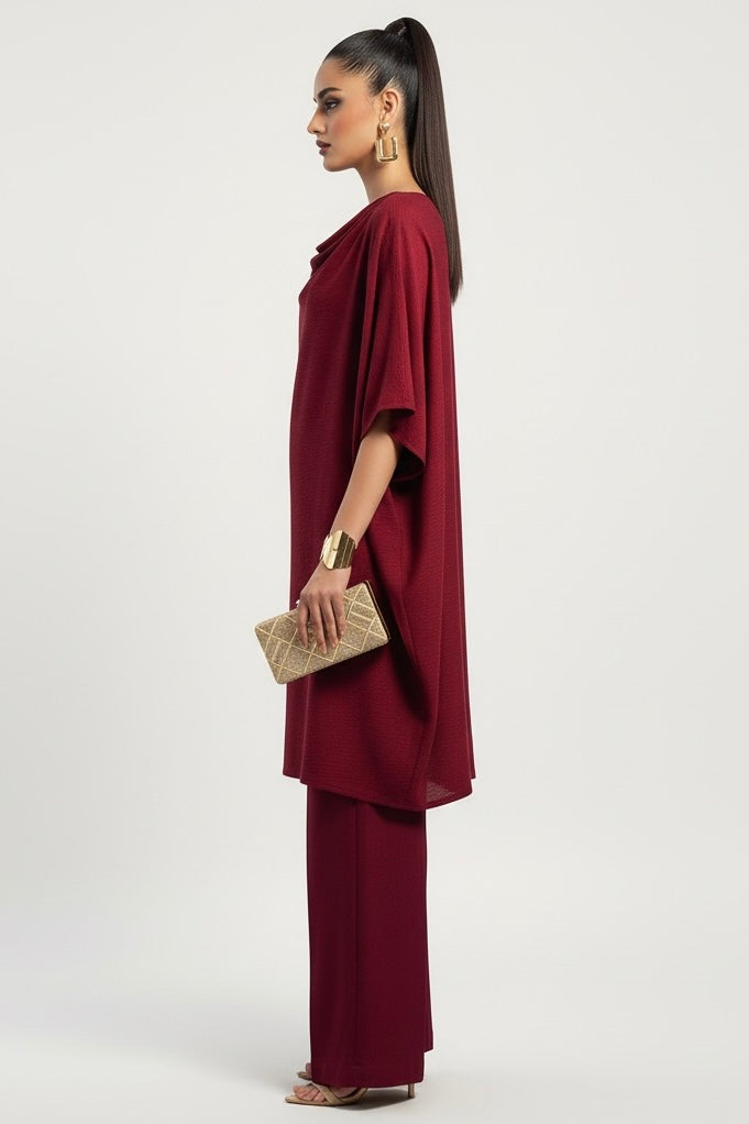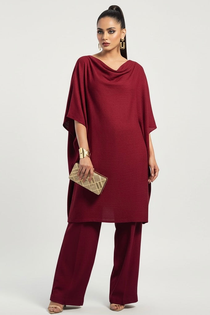 This elegant maroon kaftan-style two-piece set is crafted from premium marina wool, offering both comfort and sophistication. The relaxed silhouette features a draped neckline and wide-cut sleeves, creating a graceful, modern look. Paired with straight-cut trousers, this outfit is ideal for both formal and semi-formal occasions.