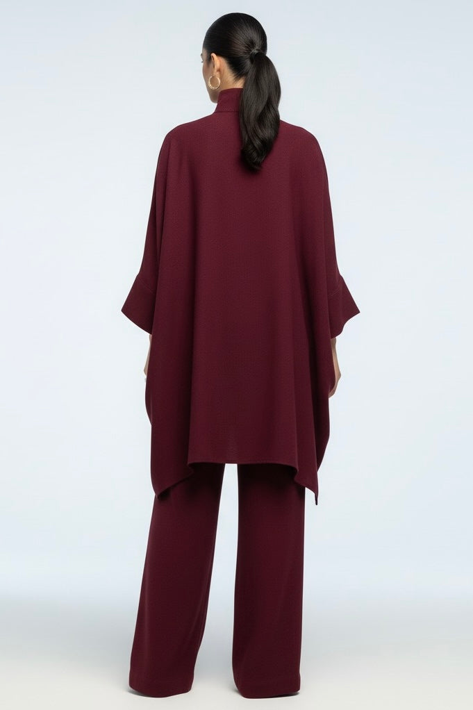 Elevate your wardrobe with this statement two-piece ensemble crafted from premium textured crepe. The emerald-teal tunic features a structured high collar and an asymmetrical draped hem that creates a graceful, flowy silhouette. Wide, turned-up cuffs add a contemporary edge, perfectly balancing sophistication with effortless ease.