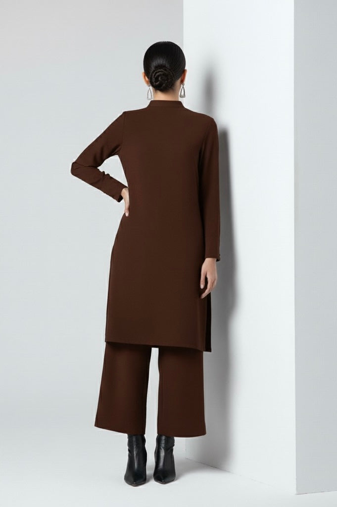 This sophisticated two-piece ensemble is crafted from premium marina wool, offering both warmth and comfort for the winter season. The long A-line kurta features a mandarin collar with a clean front pleat, full sleeves finished with buttoned cuffs, and chic side slits for effortless movement. Paired with wide-leg trousers for a modern, structured silhouette, this outfit exudes understated elegance.