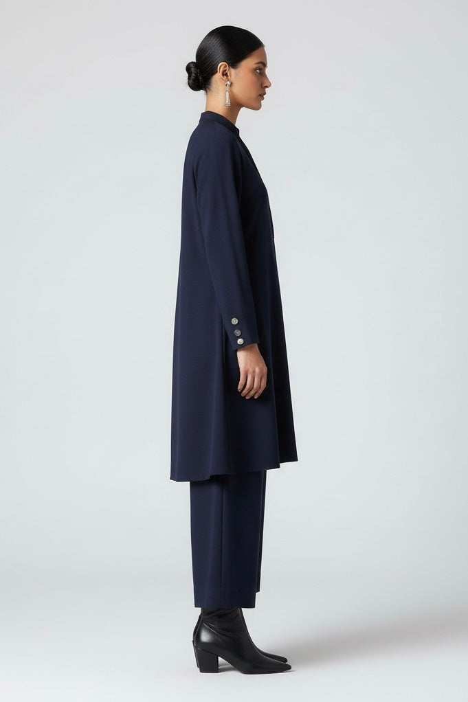 This sophisticated two-piece ensemble is crafted from premium marina wool, offering both warmth and comfort for the winter season. The long A-line kurta features a mandarin collar with a clean front pleat, full sleeves finished with buttoned cuffs, and chic side slits for effortless movement. Paired with wide-leg trousers for a modern, structured silhouette, this outfit exudes understated elegance.