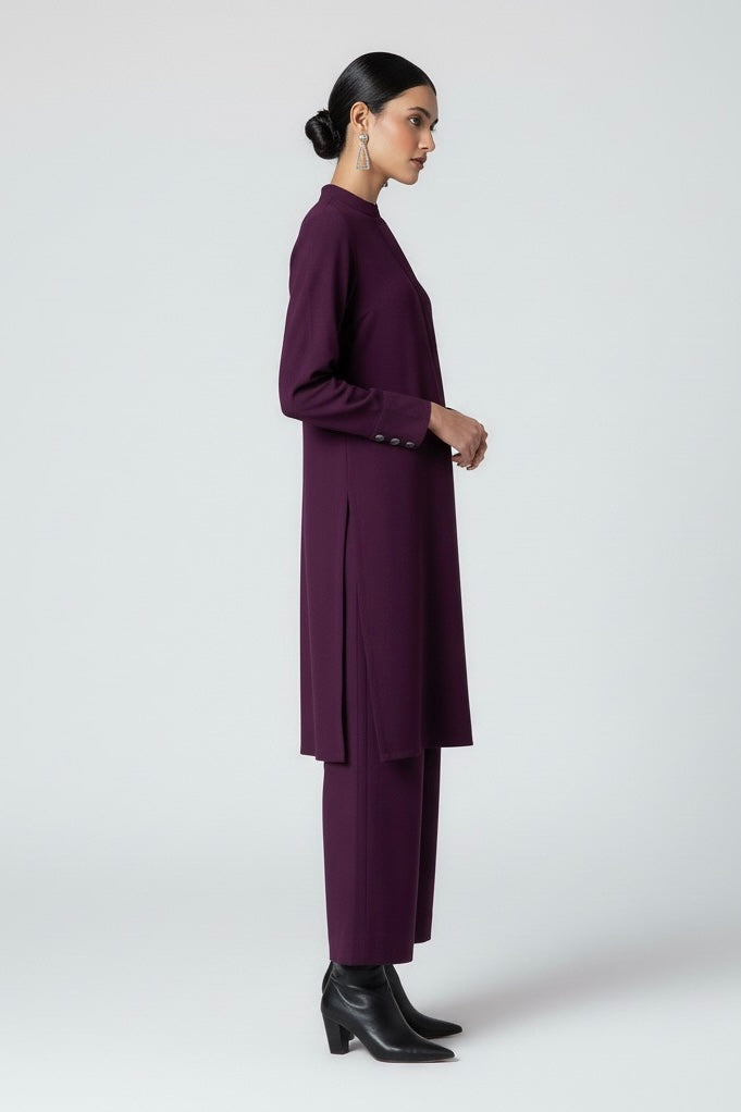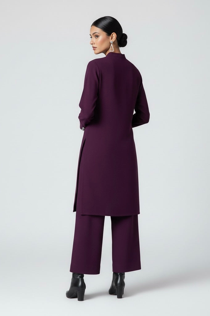 This sophisticated two-piece ensemble is crafted from premium marina wool, offering both warmth and comfort for the winter season. The long A-line kurta features a mandarin collar with a clean front pleat, full sleeves finished with buttoned cuffs, and chic side slits for effortless movement. Paired with wide-leg trousers for a modern, structured silhouette, this outfit exudes understated elegance.