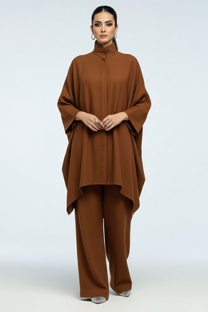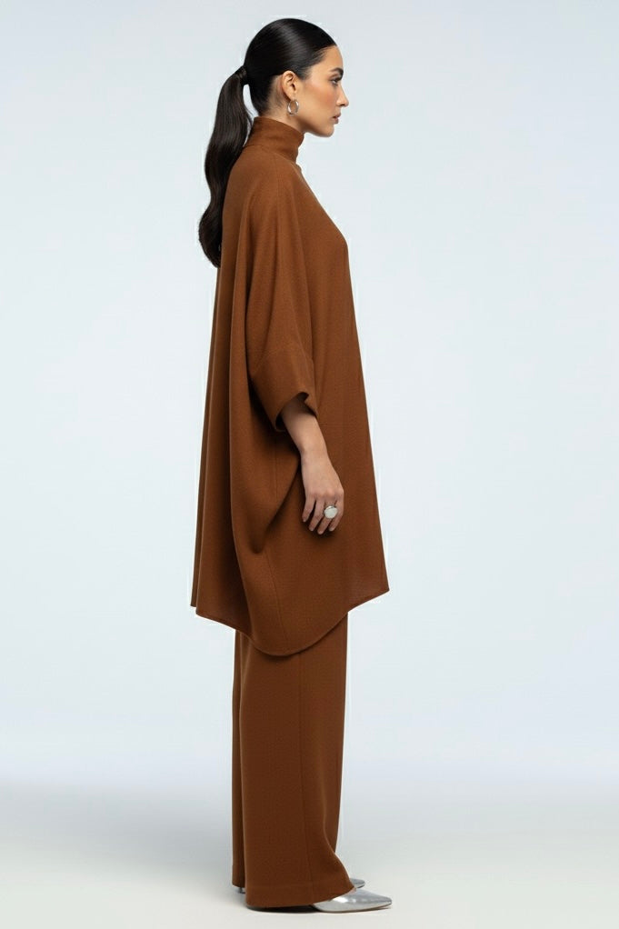 Elevate your wardrobe with this statement two-piece ensemble crafted from premium textured crepe. The emerald-teal tunic features a structured high collar and an asymmetrical draped hem that creates a graceful, flowy silhouette. Wide, turned-up cuffs add a contemporary edge, perfectly balancing sophistication with effortless ease.